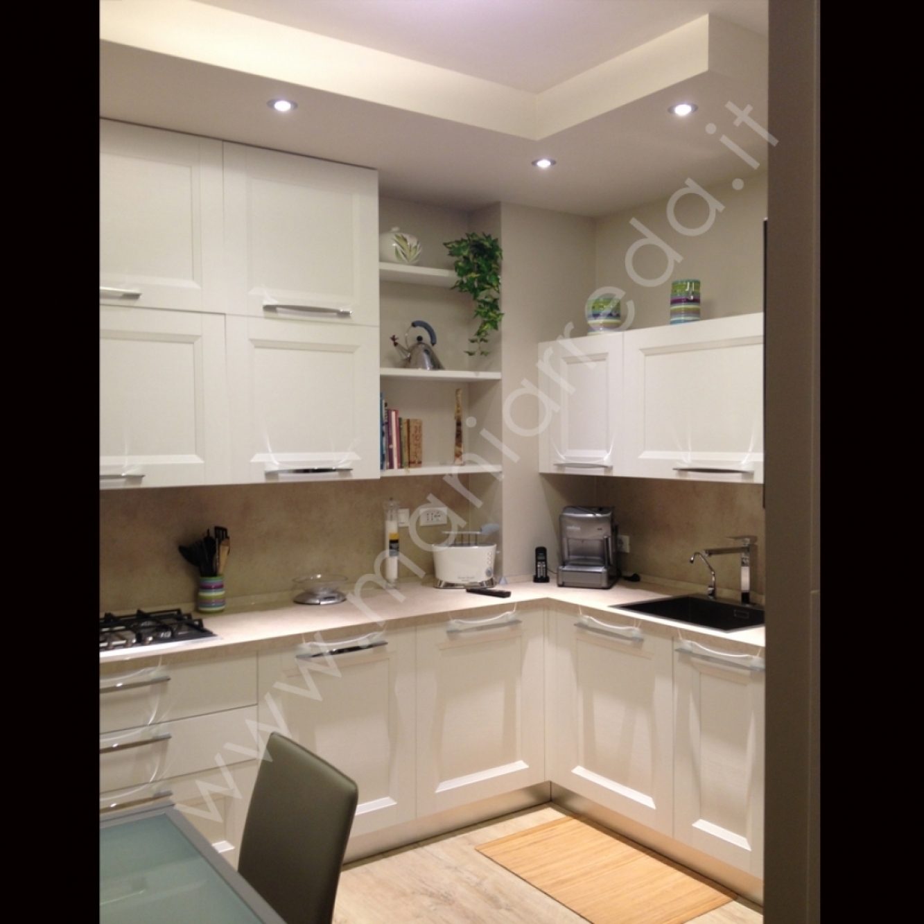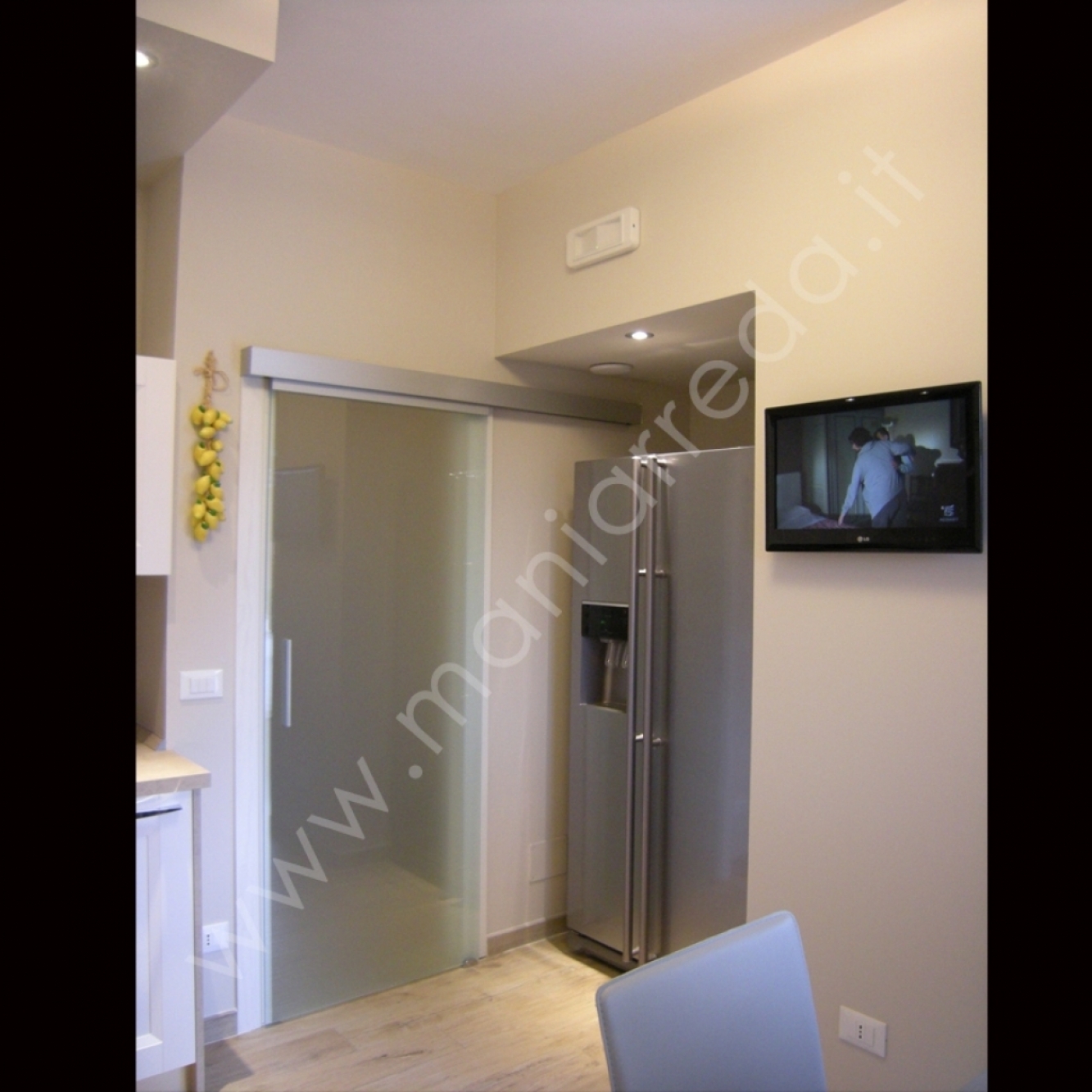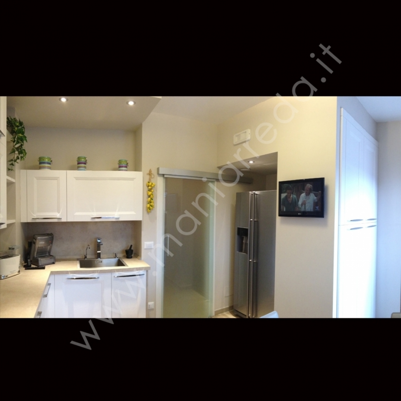 Ristrutturazione e arredo cucina Forma 2000 presso abitazione a Sasso Marconi in provincia di Bologna. Cucina completamente rivoluzionata con soffitti e nicchie in cartongesso. Nicchia creata appositamente per frigo americano doppia anta, colonna in cartongesso per TV e per nascondere dispensa a doppia anta. Arredo cucina modello Asia con ante sagomate finitura legno. Le piastrelle sono state sostituite da pannello stessa finitura del top per creare un effetto omogeneo. La porta originale è stata sostituita con porta scorrevole in vetro acidato satinato. Stessa finitura del tavolo allungabile Ingenia Bontempi completo di sedie in ecopelle.
