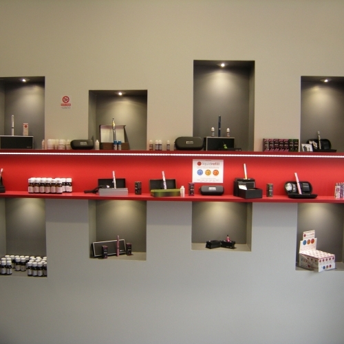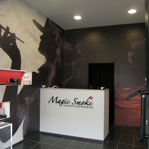 Per il negozio di sigarette elettroniche MAGIC SMOKE di Bologna, l'arredamento è stato studiato su misura con creazione dell'immagine e graHica personalizzata. Il prodotto è evidenziato da serie di nicchie particolari in cartongesso illuminate a led e arredi personalizzati per far risaltare ogni singolo elemento. Abbiamo utilizzato carta fotograHica stampata applicata direttamente al muro e l'insegna progettata appositamente per il negozio, è stata realizzata in plexiglass a rilievo.