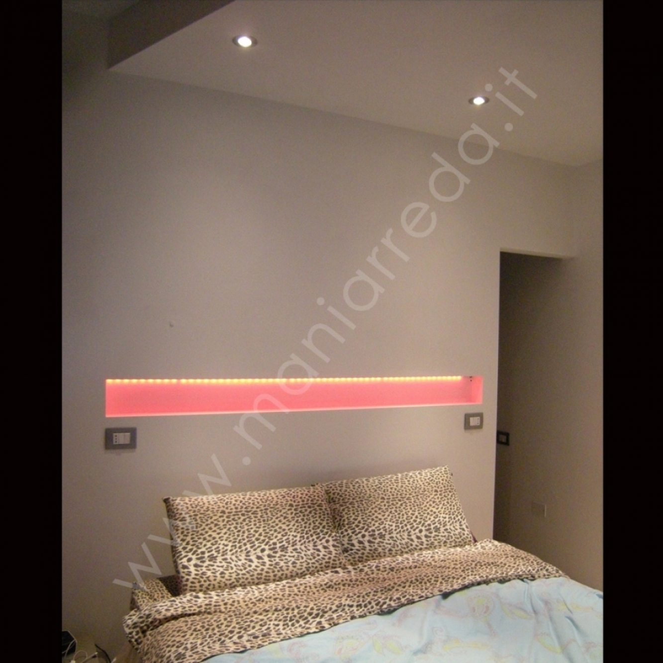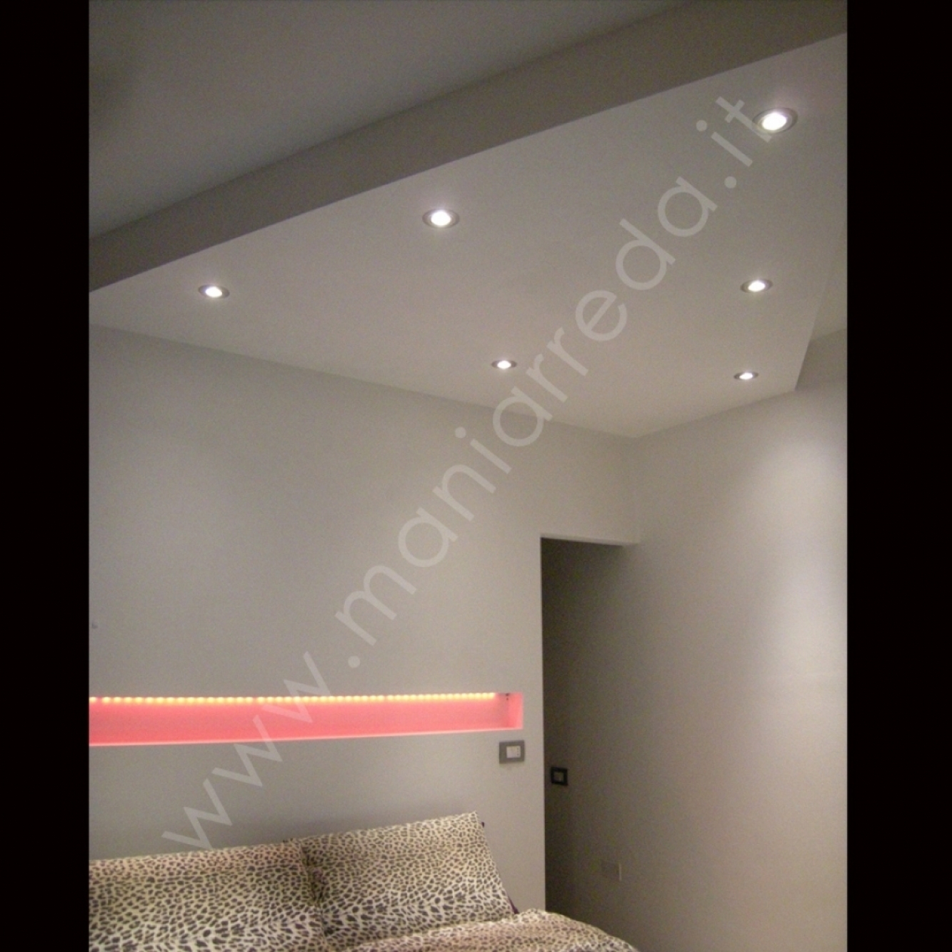 Realizzazione soffitto e parete in cartongesso per creare cabina armadio nascosta dietro al letto. La nicchia illuminata a led inserita nella parete diventa una perfetta testata. Soffitto sagomato a sbalzo sul letto con inseriti serie di luci incassate a led. Molto scenografico l'inserimento di led RGB che cambiano di colore con telecomando a distanza.