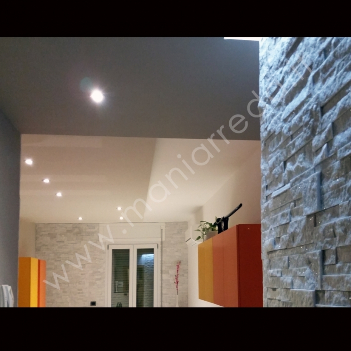 Controsoffitto in cartongesso a due livelli presso abitazione a San Lazzaro di Savena in provincia diBologna. Colonna rivestita in pietra con effetto luce indiretta soffusa a led. E' stata creata una rientranza nel cartongesso per inserire la striscia led con accensione separata. Doppi volumi per dividere la zona ingresso e la sala.